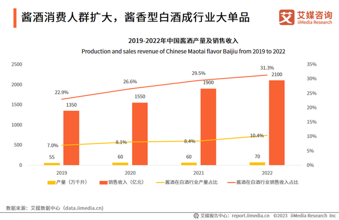 iiMedia Research(艾媒咨询)调研数据显示,在白酒香型偏好上,酱酒偏好占比达30.8%。数据显示,2022年中国酱香型白酒产量为70万千升,占白酒行业产量的10.4%,销售收入达2100亿元,占白酒行业销售收入的31.3%。随着核心消费人群传播能力和示范效应的扩大,酱酒的市场容量和消费人群仍在持续增长中,酱香型白酒成为行业大单品。