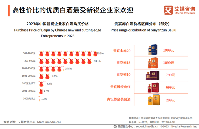 iiMedia Research(艾媒咨询)调研数据显示,购买白酒价格区间在501-1000元的人群占比最高,达35.5%;价格在2000元以上的白酒购买人群占比仅3.8%。艾媒咨询分析师认为,新锐企业家有较高的商务宴请需求,基于圈层口碑、产品包装新颖大气、性价比高又不失格调的优质白酒更受到新锐企业家的欢迎。