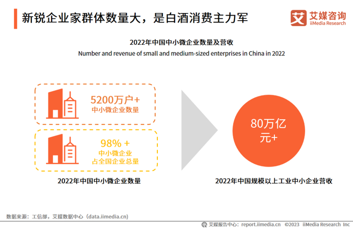 中小微企业已成为中国数量最大的企业群体,是中国国民经济的重要支柱。数据显示,2022年中国中小微企业数量已经超过了5200万户,占中国企业总量的98%以上;2022年中国规模以上工业中小企业经营收入超过80万亿元。艾媒咨询分析师认为,经营中小微企业的新锐企业家群体数量巨大,该群体具有较高的收入且商务社交频繁,对白酒需求量大,是白酒消费市场的主力军。