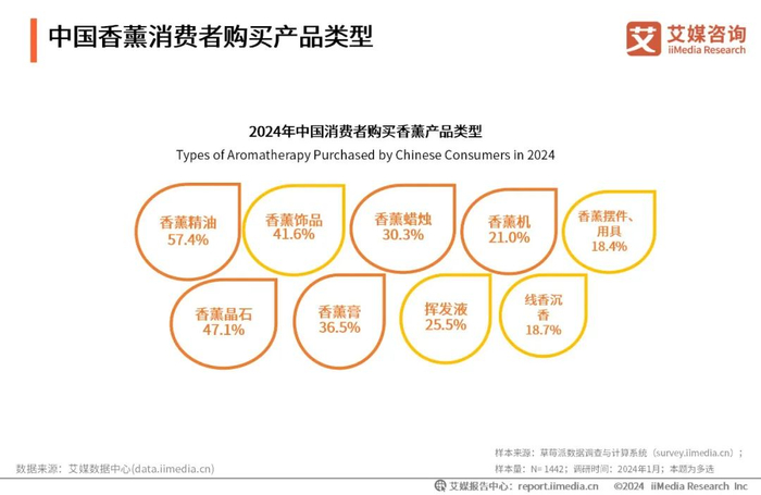 iiMedia Research(艾媒咨询)数据显示,购买香薰精油(57.4%)的中国消费者占比最多;其次为香薰晶石(47.1%)和香薰饰品(41.6%)。艾媒咨询分析师认为,当前香薰消费市场品类繁多,消费需求旺盛且多样化,香薰产品供给端应及时把握市场机遇,打造适配多样化消费需求的产品线。