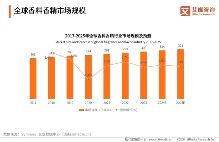 数据显示,近年来全球香料香精行业市场规模稳步增长,2023年市场规模约为306亿美元,同比增长2.3%,预计2025年将增至321亿美元。目前,北美、欧洲等发达国家的市场已趋近饱和,需求增速较低,香料香精产业逐渐向发展中国家转移。随着发展中国家消费水平的提高,香料香精行业作为配套产业将进一步发展。