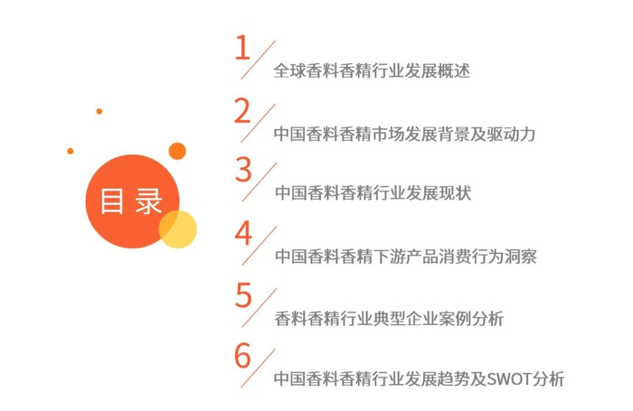 一、全球香料香精行业发展概述香料的概念及分类香精的概念及分类全球香料香精市场规模全球香料香精行业区域市场分布北美香料香精市场情况美国香料香精市场情况全球香料香精企业市场份额全球香料香精行业CR10份额全球香料香精企业CR10份额二、中国香料香精行业发展背景中国香料香精行业发展历程香料香精市场发展驱动力:政策支持(一)香料香精市场发展驱动力:政策支持(二)香料香精市场发展驱动力:收入增长香料香精市场发展驱动力:消费增长香料香精市场发展驱动力:技术创新突破香料香精市场发展驱动力:嗅觉经济香料香精市场发展驱动力:颜值经济香料香精市场发展驱动力:饮食升级香料香精行业发展驱动力:年轻消费群体成为消费主力三、中国香料香精行业发展现状中国香料香精产业链中国香料香精市场规模中国香料香精产业链上游:天然香料植物原料种植分布中国香料香精产业链上游:香兰素中国香料香精产业链上游:纯苯中国香料香精产业链上游:甲苯中国香料香精产业链上游:异戊二烯中国香料香精产业链中游:香料香精产量中国香料香精产业链中游:企业数量中国香料香精产业链中游:企业规模分布中国香料香精产业链中游:企业区域分布中国香料香精产业链下游:食品制造业中国香料香精产业链下游:香水市场规模中国香料香精产业链下游:香熏市场规模中国香料香精产业链下游:化妆品市场规模中国香料香精产业链下游:洗涤市场规模中国香料香精产业链下游:卷烟产量中国天然香料主产区:广西中国天然香料主产区:云南四、中国香料香精下游产品消费行为洞察中国消费者对食用香料香精认知及消费偏好中国消费者对香精添加剂的关注程度食用香精对中国消费者购买意愿的影响中国消费者对食用香精添加剂作用认知中国消费者对食用香料香精安全性看法中国消费者对原料为天然食材调味品的购买意愿中国香氛消费者行为洞察中国香氛消费者画像中国香氛消费者购买产品类型中国香氛消费者购买用途中国香氛消费者的月均消费支出中国香氛消费者购买渠道中国香氛消费者获取产品信息渠道中国香氛消费者对产品满意度中国香氛消费者的关注因素中国香氛消费者的品牌偏好与习惯中国香氛消费者的香调偏好影响中国香氛消费者满意度原因中国香熏消费者行为洞察中国香熏消费者画像中国香薰消费者购买产品类型中国香薰消费者购买用途中国香薰消费者月均消费支出中国香薰消费者获取产品信息渠道中国香熏消费者的关注因素中国香薰消费者对产品满意度中国香薰消费者的品牌偏好与习惯中国香薰消费者的香调偏好五、香料香精行业典型企业案例分析香料香精行业典型企业:奇华顿(一)香料香精行业典型企业:奇华顿(二)香料香精行业典型企业:奇华顿(三)香料香精行业典型企业:亚香股份(一)香料香精行业典型企业:亚香股份(二)香料香精行业典型企业:亚香股份(三)香料香精行业典型企业:华宝股份(一)香料香精行业典型企业:华宝股份(二)香料香精行业典型企业:华宝股份(三)香料香精行业典型企业:爱普股份(一)香料香精行业典型企业:爱普股份(二)香料香精行业典型企业:爱普股份(三)六、中国香料香精行业发展趋势及SWOT分析中国香料香精行业SWOT分析中国香料香精行业优势分析中国香料香精行业劣势分析中国香料香精行业机会及威胁分析图表:图表1. 香料分类图表2. 香精分类图表3. 2017-2025年全球香料香精行业市场规模及预测图表4. 全球香料香精行业区域市场分布图表5. 2014-2022年北美香料香精行业市场价值图表6. 2018-2025年美国香料香精行业市场收入及预测图表7. 全球香料香精企业市场份额图表8. 全球香料香精行业CR10份额图表9. 全球香料香精企业CR10份额图表10. 2016-2022年中国香料香精行业相关政策图表11. 2019-2023年中国香料香精的下游行业相关政策图表12. 1978-2023年中国居民人均可支配收入及增长率图表13. 1998-2023年中国居民人均食品烟酒消费支出及增长率图表14. 1999-2023年中国香料香精行业有效专利新增数量图表15. 2022年8月-2023年8月天猫香水香膏品类销售额及增速图表16. 2022年8月-2023年8月抖音香水香膏品类销售额及增速图表17. 2001-2023年中国化妆品类商品零售额图表18. 2023年中国消费者购买食品时对食品添加剂的关注度图表19. 2023年以天然食材为原料的调味品对中国消费者购买意愿的影响图表20. 中国年轻消费群体数量及特点图表21. 2016-2026年中国香料香精行业市场规模及预测图表22. 全球及中国香兰素产量与消费量图表23. 2016-2021年中国纯苯产量图表24. 2016-2021年中国甲苯产量图表25. 2016-2021年中国异戊二烯产量图表26. 2014-2026年中国香料香精产量和同比增长率及预测图表27. 2014-2023年中国香料香精行业企业累计注册数量图表28. 2023年中国香料香精行业企业注册资本图表29. 2023年中国香料香精相关企业分布TOP10图表30. 2022年中国食品制造业经济效益指标图表31. 2015-2025年中国香水行业市场规模及预测图表32. 2017-2025年中国香薰行业市场规模及预测图表33. 2015-2025年中国化妆品行业市场规模及预测图表34. 2018-2026年中国洗涤市场规模及预测图表35. 1989-2023年中国卷烟产量图表36. 2024年中国各年龄层消费者对香精添加剂的关注程度图表37. 2024年食用香精对中国消费者购买行为的影响图表38. 2024年中国消费者对食用