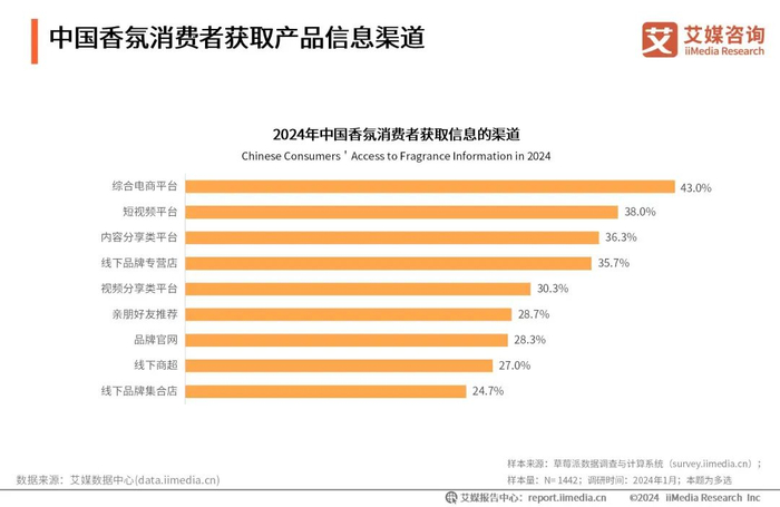 iiMedia Research(艾媒咨询)数据显示,综合电商平台(43.0%)、短视频平台(38.0%)和内容分享类平台(36.3%)是消费者获取香氛信息的主要渠道,线下品牌专营店(35.7%)是最为主流的线下渠道,消费者获取香氛信息的渠道趋于多样。艾媒咨询分析师认为,加强线上平台的渠道运营,注重线下品牌专营店的宣传推广,有助于加强消费者的品牌认知,提升品牌的市场份额。