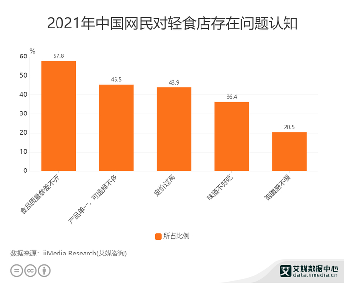 iiMedia Research(艾媒咨询)数据显示,食品质量参差不齐、产品单一与可选择不多、定价过高是网民认为轻食店存在的主要问题,分别占比57.8%、45.5%、43.9%;其次是味道不好吃、饱腹感不强,分别占比36.4%、20.5%。