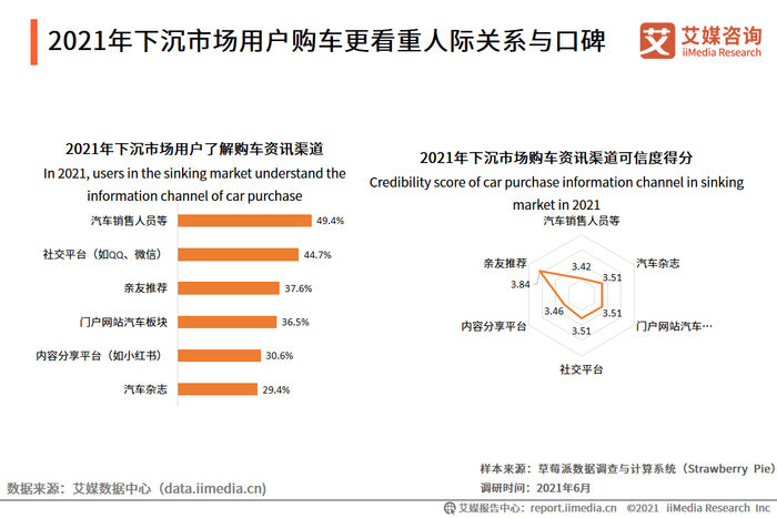 艾媒咨询分析师认为,这体现了下沉市场用户购车市场更看重人际间的推荐与口碑,是一个以人际推荐和线下沟通为主体的熟人市场。
