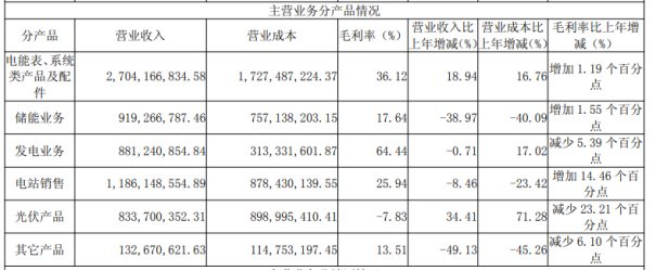 但光伏产品的毛利率却是各产品中跌幅最大的。2024年,该产品毛利率同比减少23.21个百分点至-7.83%,也是所有产品中唯一出现负毛利率的。发电业务和电站销售的毛利率分别为64.44%、25.94%,分别同比增加-5.39、14.46个百分点。