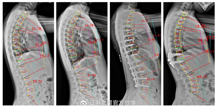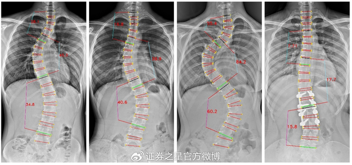 Cobb角是评估脊柱侧弯程度的"金标准",其测量结果可以用于评估病情、制定治疗计划和跟踪疾病进展。万东Cobb角自动测量系统,1秒内即可完成Cobb角计算,较传统手工测量(耗时>2 分钟)效率提升百倍。经研究验证,Cobb角平均测量误差仅3.918°,ICC为0.943,验证了该算法技术指标顶尖、误差小、重复性极好,相关论文收录于脊柱外科和脊柱研究领域的国际顶级期刊之一《European Spine Journal》。