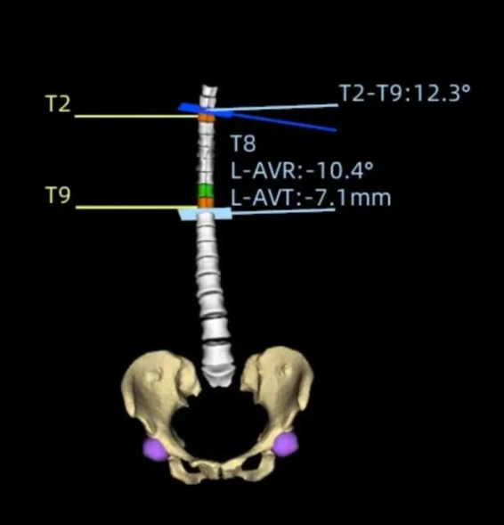 基于负重位CBCT的全脊柱三维Cobb角自动测量,实现了椎体的高精度自动分割,其Dice系数达0.9776(自动分割的结果越准确,Dice值就越接近1),误差极小;三维Cobb角测量可接受度>97.05%,关键椎体识别准确率98.53%,显著优于传统方法。基于负重位CBCT椎体轴向旋转角度自动测量,与人工测量一致性ICC 达0.76,误差控制在±3.04° 内,实现了对椎体旋转的客观、高效、可重复测量,一键自动生成,高效助力临床精准诊疗。该研究入选中华医学会放射学学术大会(CCR 2025)。