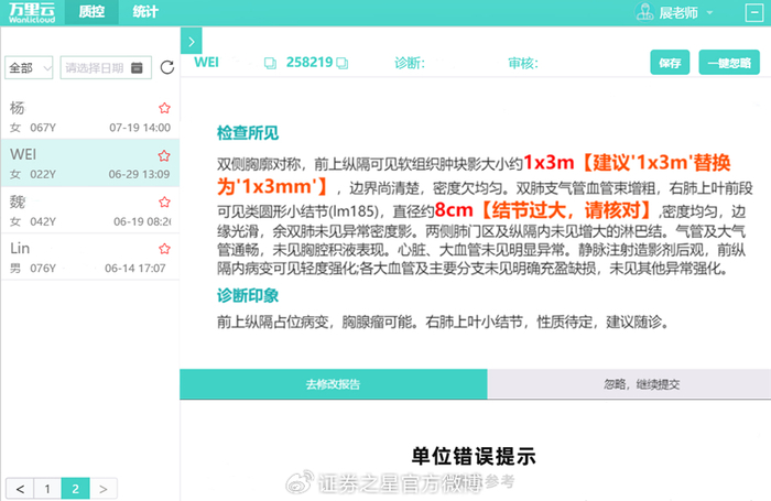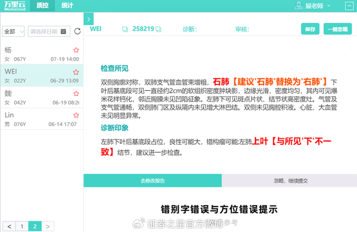美的医疗业务板块下的万里云妙笔AI质控管理系统融合自研NLP模型、针对性训练调参的医疗大语言模型与影像AI知识库,构建覆盖超30类报告规范指标的动态核查、医理高阶校验、诊断差异比对与量化评分体系,以及主动式质控管理及科室数据统计体系,实现从事后抽查向事中实时干预的转变。