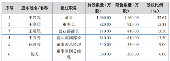 具体而言,王兴海家族为永励精密的控股股东和实控人,家族成员包含6名股东。其中王兴海及3个女儿王晓园、王媛媛、王芳芳分别持股32.67%、15.33%、13.5%、13.5%,王媛媛配偶孙时骏、王晓园配偶施戈分别持股9%、6%,上述6人合计持股90%。