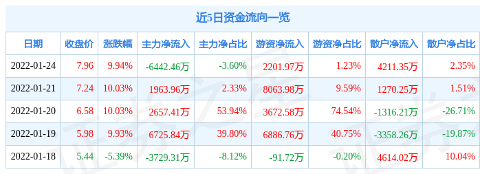 资金流向数据方面,当日主力资金净流出6442.46万元,游资资金净流入2201.97万元,散户资金净流入4211.35万元。近5日资金流向一览见下表: