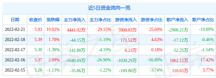 资金流向数据方面,当日主力资金净流入4441.02万元,游资资金净流入3900.83万元,散户资金净流出2908.21万元。近5日资金流向一览见下表: