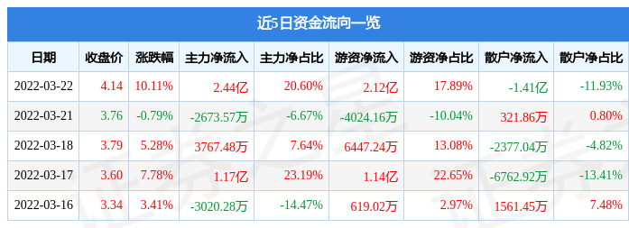 资金流向数据方面,当日主力资金净流入2.44亿元,游资资金净流入2.12亿元,散户资金净流出1.41亿元。近5日资金流向一览见下表: