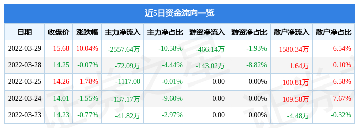 资金流向数据方面,当日主力资金净流出2557.64万元,游资资金净流出466.14万元,散户资金净流入1580.34万元。近5日资金流向一览见下表: