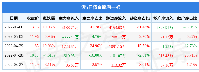 资金流向数据方面,5月6日主力资金净流入4183.71万元,游资资金净流入4153.63万元,散户资金净流出2396.91万元。