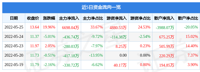 近5日资金流向一览见下表: