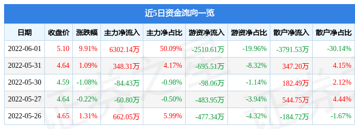 近5日资金流向一览见下表: