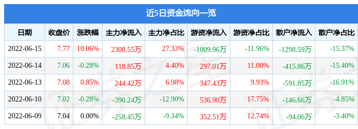 资金流向数据方面,6月15日主力资金净流入2308.55万元,游资资金净流出1009.96万元,散户资金净流出1298.59万元。
