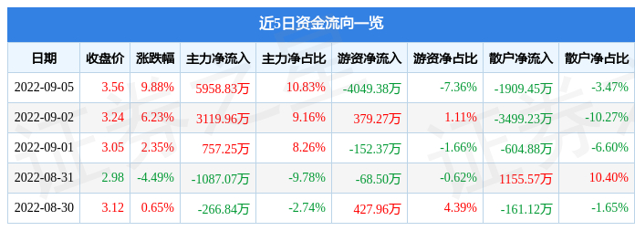 资金流向数据方面,9月5日主力资金净流入5958.83万元,游资资金净流出4049.38万元,散户资金净流出1909.45万元。