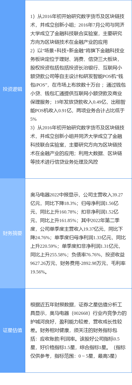 奥马电器涨停收盘,收盘价5.81元。该股于9点37分涨停,未打开涨停,截止收盘封单资金为6198.27万元,占其流通市值0.98%。