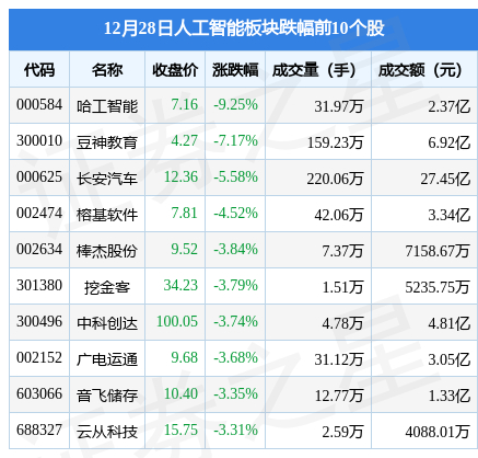 12月28日人工智能板块较上一交易日下跌1.57%,哈工智能领跌。当日上证指数报收于3087.4,下跌0.26%。深证成指报收于11010.53,下跌0.86%。人工智能板块个股涨跌见下表: