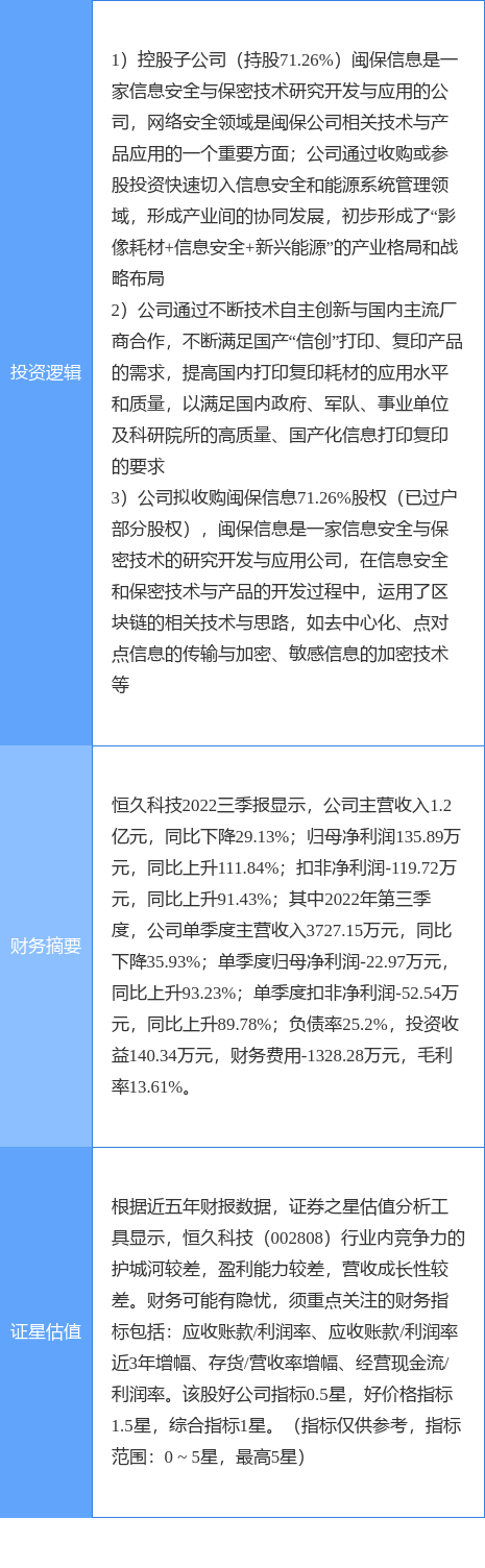 恒久科技涨停收盘,收盘价15.14元。该股于9点25分涨停,2次打开涨停,截止收盘封单资金为1.12亿元,占其流通市值4.32%。
