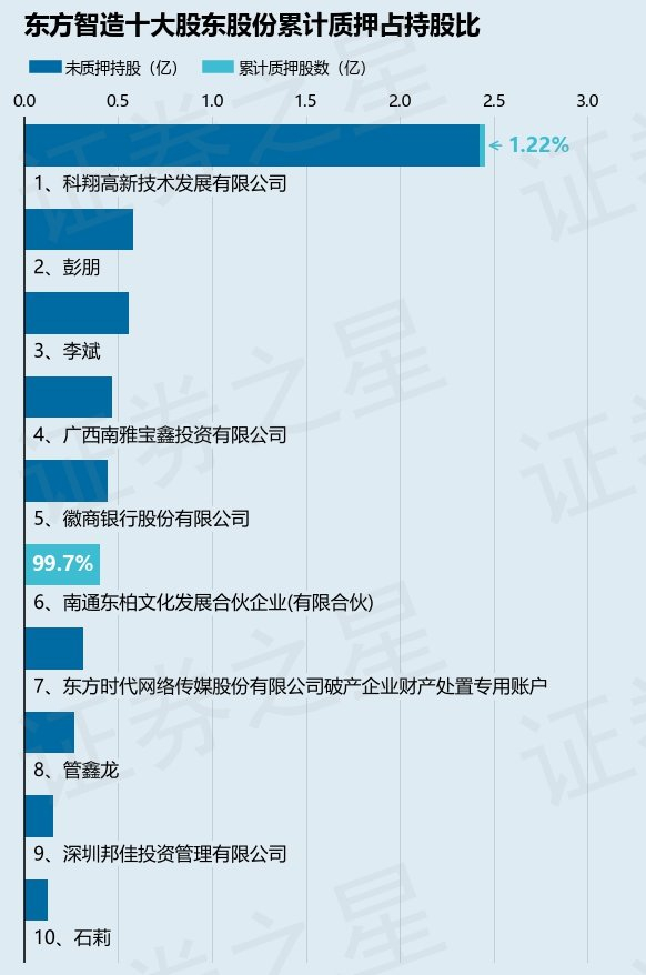 截止本公告日,股东科翔高新技术发展有限公司已累计质押股份300.0万股,占其持股总数的1.22%,股东南通东柏文化发展合伙企业(有限合伙)已累计质押股份4047.14万股,占其持股总数的99.7%。本次质押后东方智造十大股东的累计质押股份占持股比例见下图: