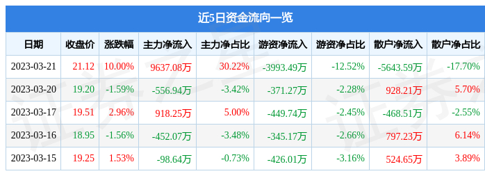 3月21日的资金流向数据方面,主力资金净流入9637.08万元,占总成交额30.22%,游资资金净流出3993.49万元,占总成交额12.52%,散户资金净流出5643.59万元,占总成交额17.7%。