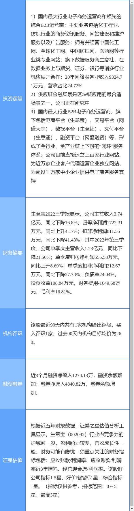 生 意 宝涨停收盘,收盘价21.12元。该股于13点16分涨停,未打开涨停,截止收盘封单资金为5505.01万元,占其流通市值1.04%。