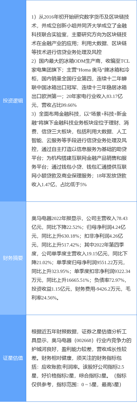 奥马电器涨停收盘,收盘价7.02元。该股于9点40分涨停,未打开涨停,截止收盘封单资金为3354.35万元,占其流通市值0.44%。