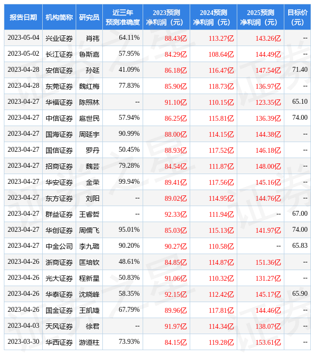 证券之星数据中心根据近三年发布的研报数据计算,华安证券金荣研究员团队对该股研究较为深入,近三年预测准确度均值高达99.94%,其预测2023年度归属净利润为盈利89.41亿,根据现价换算的预测PE为27.44。