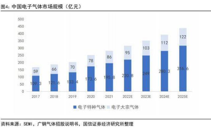 从2022年的最新数据来看,国内电子特种气体增长更快的趋势得到了延续。根据研究机构TECHCET发布的数据,2022年全球电子特气市场规模为50.01亿美元,同比增长 10.20%,创下历史新高。预计到2025年,全球电子特气市场规模将达到60.23亿美元,2022-2025 年均增速为6.39%,行业规模持续增长,未来空间广阔。从国内电子特气市场来看,根据中国半导体工业协会的数据,2022年我国电子特气市场规模为231亿元,同比增长6.94%。未来随着全球半导体产业链不断向国内转移,将显著拉动我国电子特气需求,也将进一步加速电子特气国产化进程。