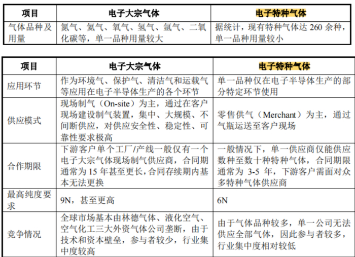 不过,在日常的行业分类中,更多地按照气体的用量,将电子气体分为电子大宗气体和电子特种气体,前者单一品种用量较大,渗透在半导体生产的各个环节。而后者单一品种用量较小,一般在生产的某个特定环节使用。