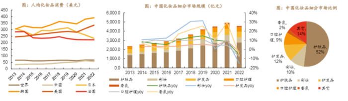 根据Euromonitor的数据显示,2022年中国人均化妆品消费约为56美元,相较于全球平均水平的68美元,仍有明显的差距。尽管与成熟的美妆市场相比仍有差距,但考虑到疫情逐渐结束,预计未来中国美妆消费水平将保持乐观增长趋势。