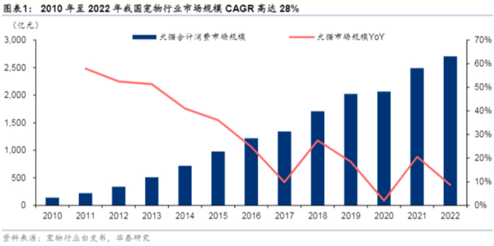 将单宠消费拆解为人均 GDP 和(养宠支出/人均 GDP 比例)两项指标。前者体现了经济基础带来的养宠支出的自然提升,后者则突显了宠物在人们心中的重要性的提升。预计到2026年,我国宠物行业市场规模有望达到5232亿,相较于2022年,有望实现翻倍增长。
