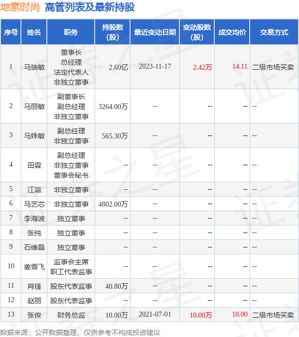 证券之星消息,根据12月4日市场公开信息、上市公司公告及交易所披露数据整理,地素时尚(603587)最新董监高及相关人员股份变动情况:2023年12月1日至2023年12月4日公司董事,高级管理人员马瑞敏共增持公司股份5.45万股,占公司总股本为0.0114%。变动期间公司股价下跌1.37%,12月4日当日收盘报13.7元。
