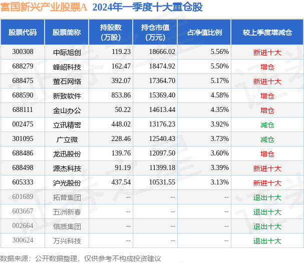 根据2024基金Q1季报公募基金重仓股数据,重仓该股的公募基金共6家,其中持有数量最多的公募基金为富国新兴产业股票A。富国新兴产业股票A目前规模为23.65亿元,最新净值1.549(5月15日),较上一交易日下跌0.13%,近一年下跌26.41%。该公募基金现任基金经理为孙权。孙权在任的基金产品包括:富国创新企业灵活配置混合(LOF)A,管理时间为2022年7月28日至今,期间收益率为-31.2%。