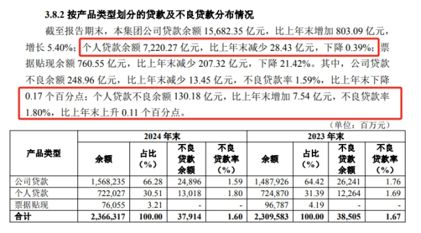 事实上,早在2023年末,华夏银行就曾出现这个征兆,当年个人贷款不良余额122.64亿元,比2022年末增加16.06亿元,不良贷款率1.69%,比上年末上升0.18个百分点。