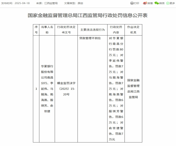 4月18日,国家金融监督管理总局江西监管局出具的一则行政处罚信息公开表显示,因贷款管理不到位,江西监管局对华夏银行南昌分行罚款80万元。