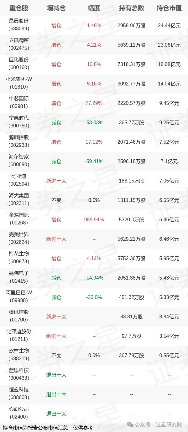 其中比亚迪(A和H)基本为建仓买入,完美世界和腾讯为加仓买入(进十大)。
