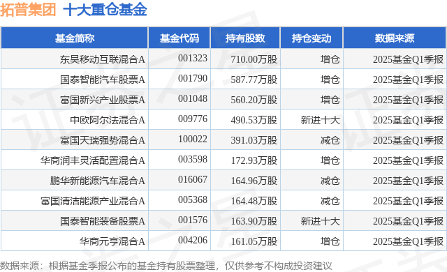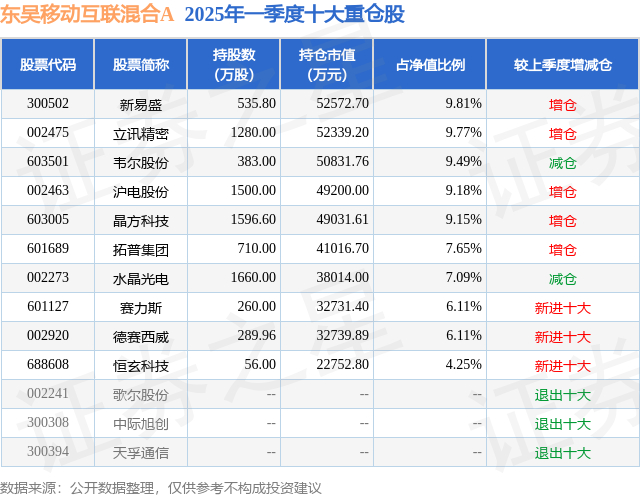 根据2025基金Q1季报公募基金重仓股数据,重仓该股的公募基金共170家,其中持有数量最多的公募基金为东吴基金的东吴移动互联混合A。东吴移动互联混合A目前规模为22.79亿元,最新净值2.8398(4月22日),较上一交易日下跌1.37%,近一年上涨14.93%。该公募基金现任基金经理为刘元海。刘元海在任的基金产品包括:东吴新趋势价值线混合,管理时间为2019年4月29日至今,期间收益率为233.23%;东吴新能源汽车股票A,管理时间为2022年1月25日至今,期间收益率为21.92%;东吴嘉禾优势精选混合A,管理时间为2023年8月15日至今,期间收益率为15.85%。