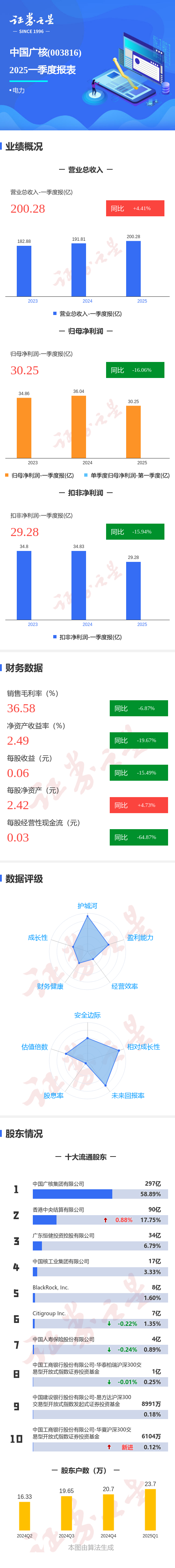 证券之星消息,中国广核2025年一季报显示,公司主营收入200.28亿元,同比上升4.41%;归母净利润30.26亿元,同比下降16.07%;扣非净利润29.28亿元,同比下降15.94%;负债率59.68%,投资收益5.14亿元,财务费用12.8亿元,毛利率36.58%。