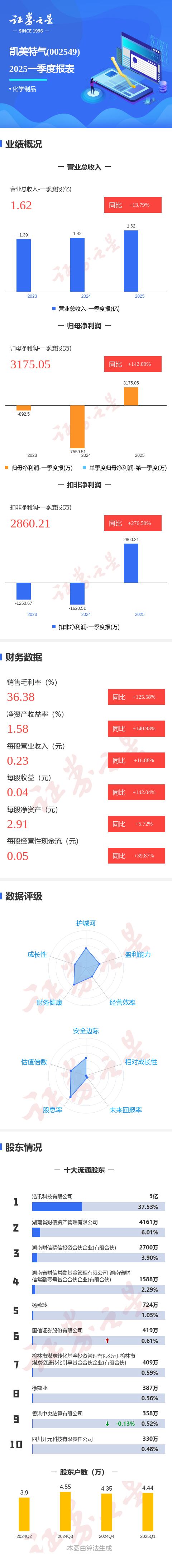 证券之星消息,凯美特气2025年一季报显示,公司主营收入1.63亿元,同比上升13.79%;归母净利润3175.06万元,同比上升142.0%;扣非净利润2860.22万元,同比上升276.5%;负债率29.01%,投资收益44.31万元,财务费用-46.85万元,毛利率36.38%。