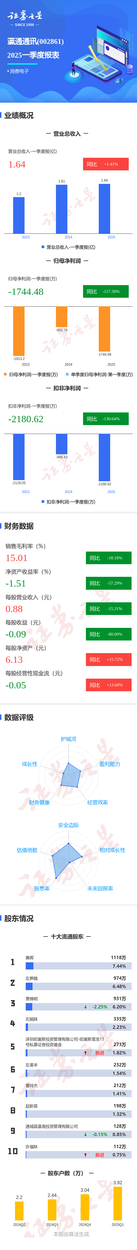 证券之星消息,瀛通通讯2025年一季报显示,公司主营收入1.64亿元,同比上升1.42%;归母净利润-1744.49万元,同比下降117.3%;扣非净利润-2180.63万元,同比下降130.65%;负债率27.77%,投资收益57.77万元,财务费用58.74万元,毛利率15.01%。