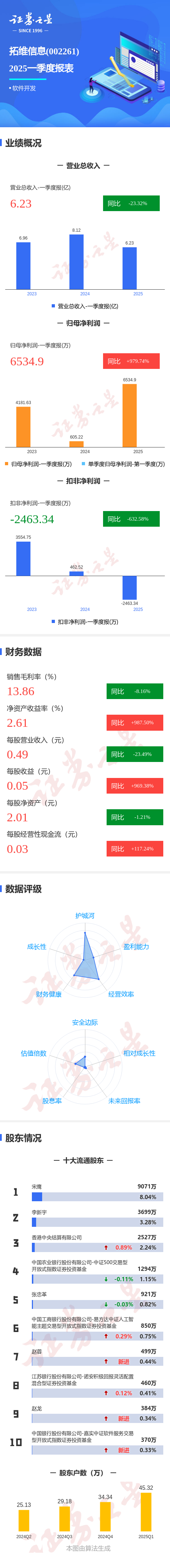 证券之星消息,拓维信息2025年一季报显示,公司主营收入6.23亿元,同比下降23.33%;归母净利润6534.91万元,同比上升979.75%;扣非净利润-2463.35万元,同比下降632.58%;负债率48.55%,投资收益118.93万元,财务费用210.82万元,毛利率13.86%。