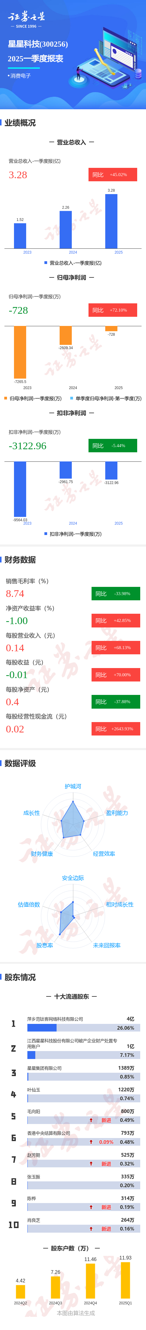 证券之星消息,星星科技2025年一季报显示,公司主营收入3.28亿元,同比上升45.02%;归母净利润-728.01万元,同比上升72.1%;扣非净利润-3122.97万元,同比下降5.44%;负债率46.35%,投资收益1288.31万元,财务费用41.83万元,毛利率8.74%。