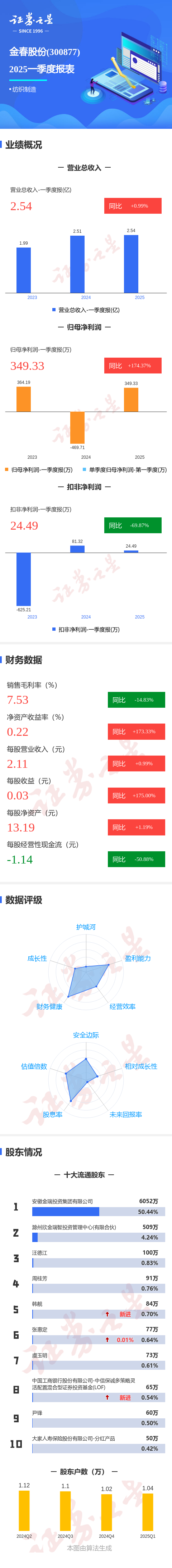 证券之星消息,金春股份2025年一季报显示,公司主营收入2.54亿元,同比上升1.0%;归母净利润349.33万元,同比上升174.37%;扣非净利润24.5万元,同比下降69.88%;负债率12.67%,投资收益514.64万元,财务费用64.34万元,毛利率7.53%。