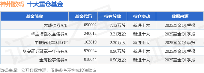 持有神州数码最多的基金为大成债券A/B,目前规模为4.75亿元,最新净值1.0866(4月25日),较上一交易日上涨0.06%,近一年上涨4.06%。该基金现任基金经理为王立。