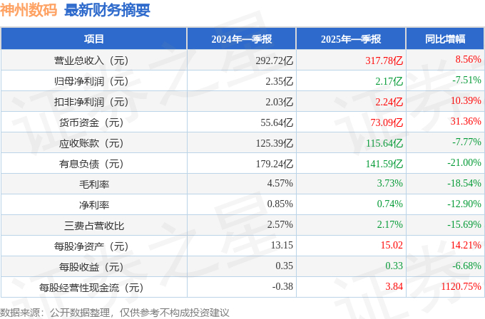 据证券之星公开数据整理,近期神州数码(000034)发布2025年一季报。截至本报告期末,公司营业总收入317.78亿元,同比上升8.56%,归母净利润2.17亿元,同比下降7.51%。按单季度数据看,第一季度营业总收入317.78亿元,同比上升8.56%,第一季度归母净利润2.17亿元,同比下降7.51%。本报告期神州数码公司应收账款体量较大,当期应收账款占最新年报归母净利润比达1536.32%。
