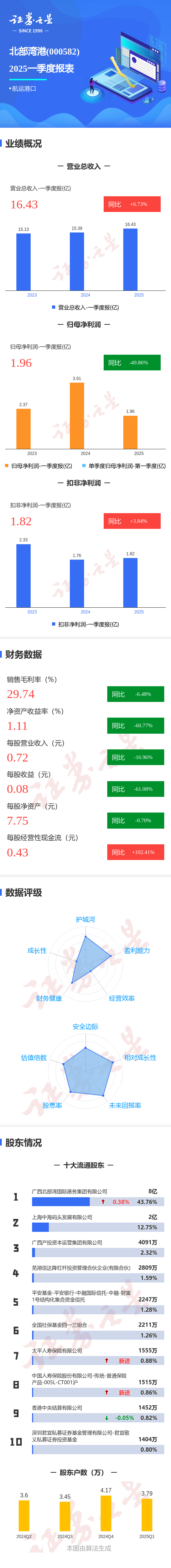 证券之星消息,北部湾港2025年一季报显示,公司主营收入16.43亿元,同比上升6.73%;归母净利润1.96亿元,同比下降49.87%;扣非净利润1.83亿元,同比上升3.85%;负债率44.53%,投资收益-275.42万元,财务费用6998.5万元,毛利率29.74%。